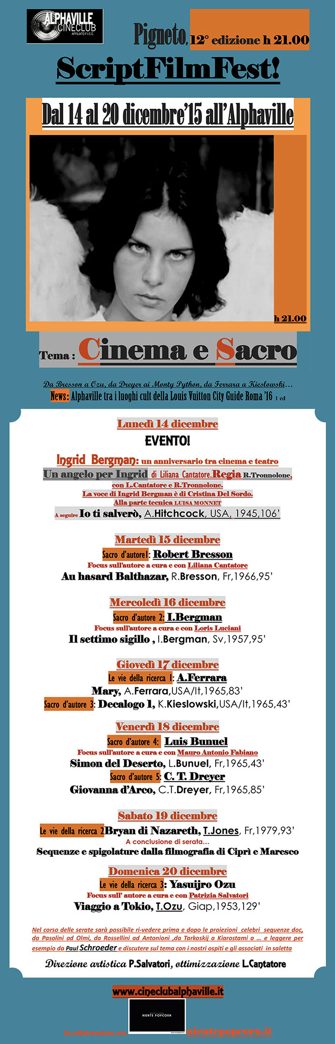 Dunque lo ScriptfilmFest 2015 propone un ventaglio di lungometraggi d’autore che possono essere sintetizzati attraverso due contenitori di percorso… da una parte il SACRO D’AUTORE, in cui a raccontarci della ricerca divina sono i maestri del cinema universale, da Bunuel con il suo nulla esistenziale a Bresson con l’immagine del Male a Dreyer attraverso la testimonianza, a Bergman narratore iconico della Morte, a Kieslowski …dall’altra LE VIE DELLA RICERCA dai Monty Python attraverso la desacralizzazione a Ferrara attraverso l’ indagine ad Ozu mediante lo studio attento dell’umano quotidiano.