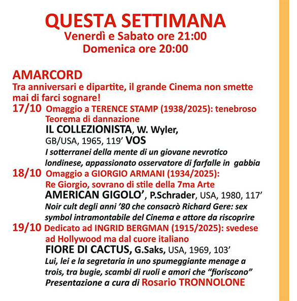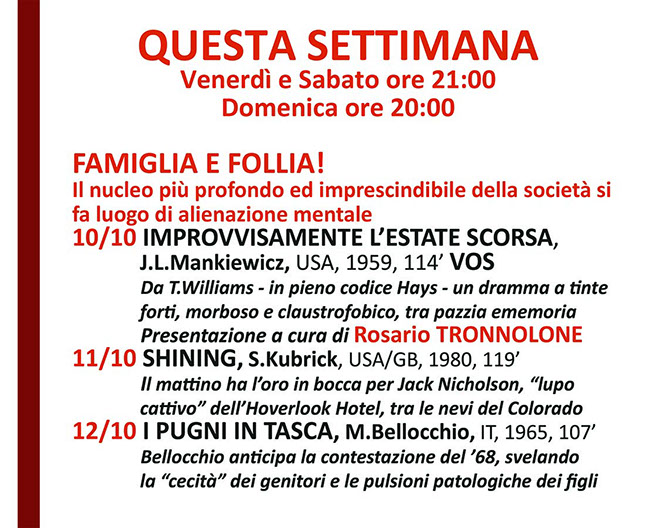 GRANDE AUTUNNOALL'ALPHAVILLE La ripresa autunnale della programmazione filmica all’Alphaville riserva interessanti novità. Per evitare ogni malinconia dell’estate appena finita, cominceremo con tre film della “Stand up comedy”: il primo è “Lenny”, di B. Fosse, del 1974, in versione originale, con sottotitoli italiani, che ci permetterà di assistere ad una favolosa rappresentazione artistica di Dustin Hoffman; seguirà un film oggi diventato “cult”, “Joker”, di T. Phillips, del 2019, con una notevole “performance” di Joaquin Phoenix; per finire con il film più iconico, entrato ormai nella Storia del cinema, “Re per una notte”, di Martin Scorsese, del 1983, con i magici Robert De Niro e Jerry Lewis, i cui i ruoli attesi dai personaggi, cioè ruolo serio per De Niro e ruolo comico per Lewis, vengono scambiati, provocando situazioni inimmaginabili. Nel secondo “week-end” ci immergeremo in una tematica, oggi attualissima, inerente il rapporto tra famiglia e follia, proiettando tre film fondamentali: il primo, “Improvvisamente l’estate scorsa”, un capolavoro di J.L. Mankiewicz, del 1958; il secondo, “Shining”, del grande Autore S. Kubrick, del 1980; il terzo, “I pugni in tasca”, opera prima del nostro M. Bellocchio, del 1965.Il terzo fine settimana sarà dedicato a figure storiche del mondo dello spettacolo “tout court”, cioè gli attori Terence Stamp, che ci ha lasciato da poco, il maestro della moda Giorgio Armani, e la grande attrice Ingrid Bergman, nella fase più matura della sua carriera, di cui quest’anno ricorre l’anniversario della nascita, con i rispettivi film: “Il collezionista”, di W. Wyler, raro da vedere; “American Gigolo”, di P. Sharader, del 1980, che indirettamente con gli “abiti” del protagonista ci permetterà di ricordare il nostro maestro di moda; infine, “Fiore di cactus”, di G. Saks, 1969, che ci mostrerà una inedita “performance” della diva Bergman. Alla fine del mese entreremo nel labirinto autoriale del nostro Cineclub, in cui ci sono sorprese sempre piacevoli da rivedere. In questo caso abbiamo scelto tre film che restano nella mente di chi li osserva, rappresentando Autori e temi variegati, ma rilevanti, connessi alla Natura, alla Psiche umana, alla Libertà espressiva, e precisamente: “Dersu Uzala”, del Maestro assoluto di cinema A. Kurosawa, del 1975; “Obsession – Complesso di colpa”, dell’immaginifico B. De Palma, del 1976; “The Rocky Orror Picture Show”, di J. Sharman, del 1975, “cult” fuori dagli schemi dei costumi sociali, ancora oggi in diverse sale cinematografiche mondiali.Un mese, quindi, aperto a visioni sempre qualitativamente elevate che, si spera, potranno soddisfare i palati più fini degli spettatori che decideranno di venirci a trovare al Cineclub.VIVA IL BEL CINEMA!
