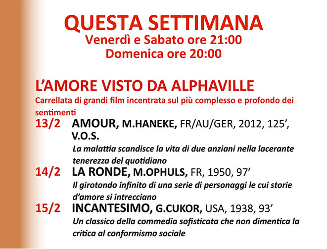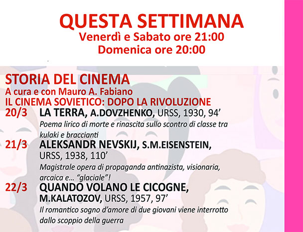 Nel mese di febbraio del 2026 la programmazione del Cineclub allarga i propri orizzonti, toccando tematiche allo stesso tempo nuove e del passato, in linea con un percorso variegato dei film scelti da proporre.Iniziamo da un dovuto ricordo di due pilastri del cinema, scomparsi da poco.Il primo è quello di un regista innovativo e fuori del comune, l’ungherese BELA TARR, certamente poco conosciuto dal grande pubblico, ma significativo sul piano linguistico filmico e su quello dei contenuti, con “L’uomo di Londra”, del 2007.Il secondo riguarda una delle attrici più “iconiche” che sia mai esistita, cioè BRIGITTE BARDOT, di cui si sono scelti i due film in cui, forse, ha fornito le sue migliori interpretazioni nella sua lunga carriera: “Il disprezzo (Le Mépris)”, di Godard, del 1963 e “La verità”, di Clouzot, del 1960.Con la seconda settimana del mese tocchiamo un anniversario popolare inerente l’amore, cioè San Valentino, per ricordare il quale abbiamo scelto delle varianti cinematografiche interessanti l’argomento, riguardanti epoche diverse: “Amour” di Hanecke, del 2012, “La Ronde” del grande regista Olphus, del 1950 e, infine, “Incantesimo”, del visionario Cukor, del 1938.Nel terzo week-end ripercorriamo un momento fondamentale dello sviluppo della Storia del cinema: il Cinema Rivoluzionario Sovietico, con una scelta di film fondamentale per capire questa avanguardia artistica: “Sciopero”, del 1925, di Eisenstein, “La Madre” di Pudovkin, del 1926 e infine “L’uomo con la macchina da presa” di Vertov, del 1929, per capire anche le differenze sul piano del linguaggio filmico fra i diversi partecipanti a quel movimento innovativo.Nell’ultima settimana del mese, diamo spazio a tematiche socio-politiche, aiutati dalla presentazione del libro “Cinema e potere. Leggere la propaganda nella storia del cinema di Hollywood”, di Federico Greco, alla presenza dell’autore, con la proiezione dei film: “Il Dottor Stranamore, di Kubrick, “A.I. Artificial Intelligence”, di Spielberg, e “A prova di errore”, di Lumet. Sempre vivaIL BEL CINEMA!