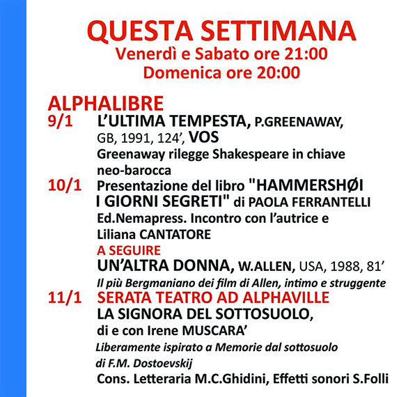 Col nuovo anno il cineclub Alphaville proseguirà nella sua “mission” di essere centro culturale di informazione cinematografica, e non solo, di dibattito culturale ad ampio spettro e “luogo” di incontro con i nuovi e vecchi soci, seguendo le tracce indelebili tracciate dai nostri fondatori: Patrizia Salvatori e Giuseppe Palazzolo.Per quanto riguarda il mese di gennaio 2026 abbiamo elaborato una proposta culturale multiforme, che va dalla presentazione di libri, al teatro e, come sempre, interessanti opere cinematografiche.Si comincia immediatamente con tre film in cui l’attore principale è CARY GRANT, di cui si potrà apprezzare l’esperienza multiforme di questa icona cinematografica: dalla commedia, al giallo drammatico.Dal 9 gennaio all’ 11 gennaio la nostra programmazione assume i connotati della multiculturalità: dopo un primo assaggio con la trasposizione cinematografica di un’opera teatrale di Shakespeare, “La Tempesta” di P. Greeneway, in versione originale, il giorno seguente potrete apprezzare la presentazione del libro "HAMMERSHØI I GIORNI SEGRETI" di PAOLA FERRANTELLI, che coinvolgerà la nostra Presidente «ad honorem» Liliana Cantatore, a cui seguirà il film di Woody Allen “Un’altra donna”. La domenica, proseguiremo con la nostra proposta di “Alpha Teatro” con l’opera “LA SIGNORA DEL SOTTOSUOLO”, di e con IRENE MUSCARA’, tratta dal romanzo di F.M. Dostoevskij, “Memorie dal sottosuolo”.Il terzo week-end del mese proporremo tre film che rappresentano visivimente l’incontro tra cinema e musica rock, con tre opere di T.HAYNES, K. RUSSELL e G.VAN SANT.Il fine settimana successivo abbiamo programmato la seconda parte dei film della storia del cinema dedicato all’espressionismo tedesco, in cui recuperiamo capolavori fondamentali come il “Nosferatu il Vampiro” di F. MURNAU, “La bambola di carne” di E. LUBICTH e, infine, il poco visto negli ultimi anni, “Dottor Mabuse” (la prima parte) di F. LANG, per approfondire la conoscenza, specialmente dei giovani di questo importate movimento artistico, come sempre curati dal nostro Prof. Mauro Antonio Fabiano.Nell’ultimo fine settimana riproponiamo tre film fondamentali per conosce le diverse sfaccettature della “Nouvelle Vague” francese con tre opere di Truffaut, Rivette e Rohmer, che hanno caratteristiche originali rispetto ai film più conosciuti delle loro rispettive filmografie.Buona visione, in tutti i sensi, e Buona conoscenza dell’arte in tutte le sue forme!!! Buon 2026!sempre conIL BEL CINEMA!